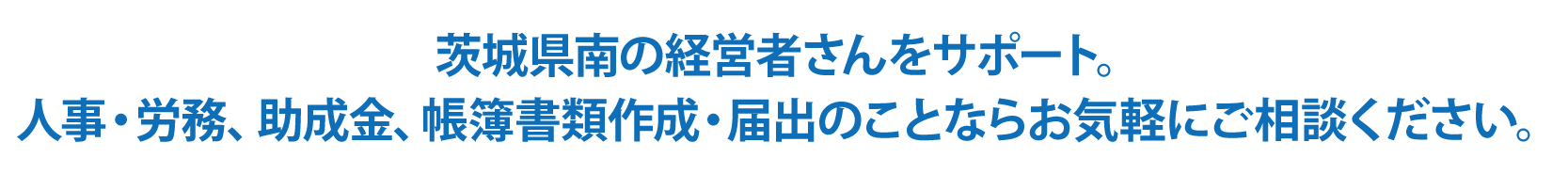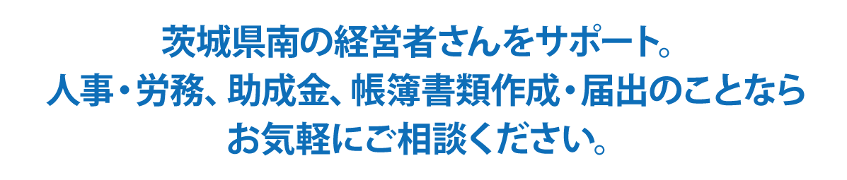 茨城県南の経営者さんをサポート。人事・労務、助成金、帳簿書類作成・届出のことならお気軽にご相談ください。